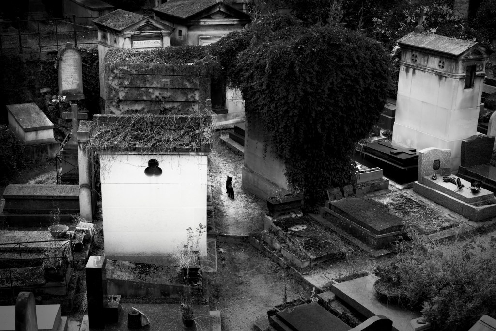 You had fun mixing up black and white and color or partial color, didn’t you? These are great. The cemetery is very interesting! I see the same woman in front of the metro and window shopping.. 🙂