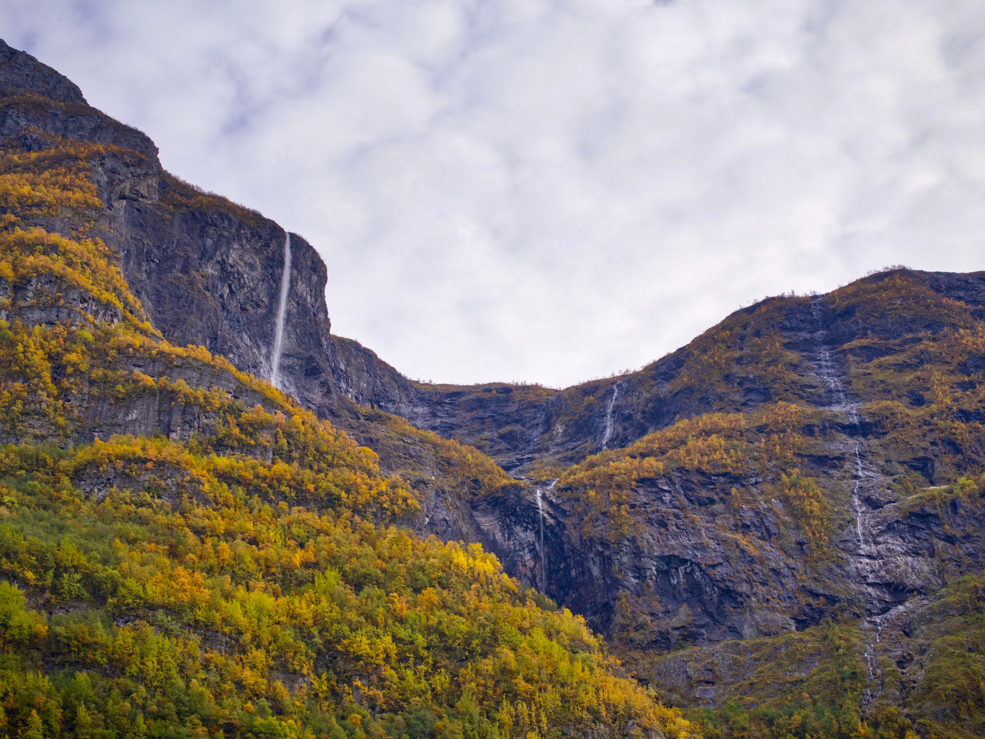 Waterfalls seen while zig-zagging on the hairpins of upper Flåmsdalsvegen