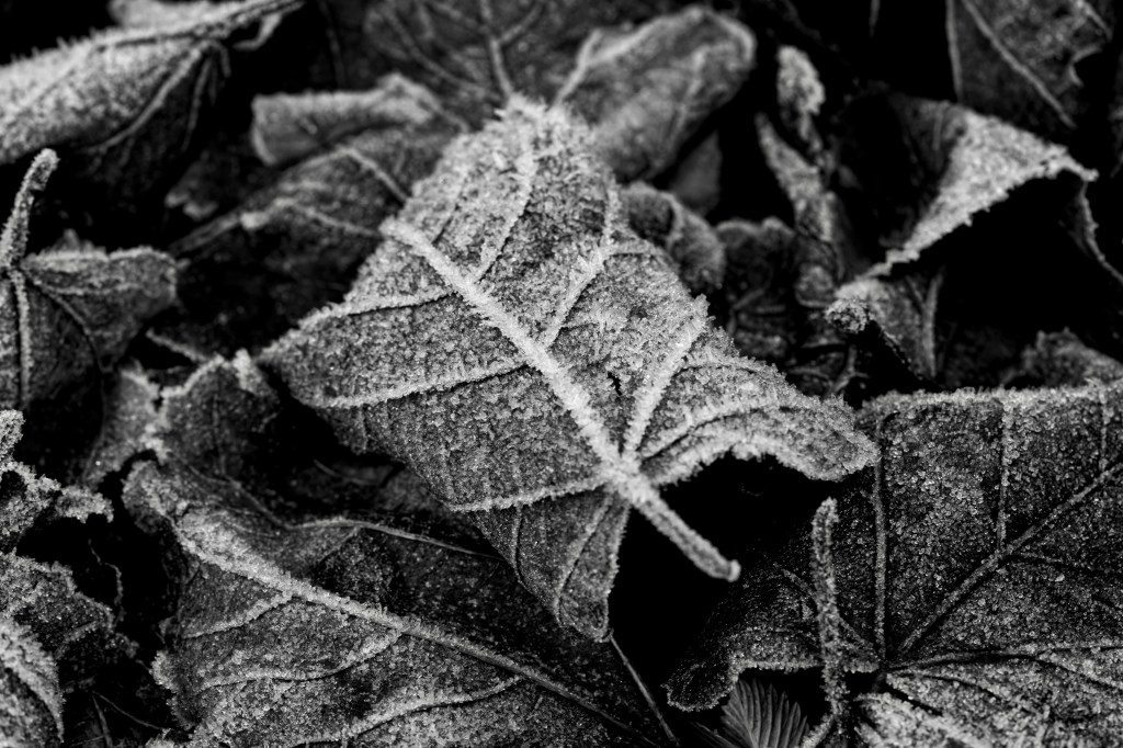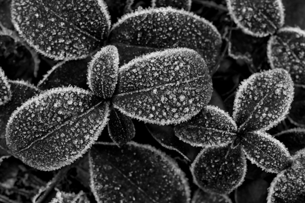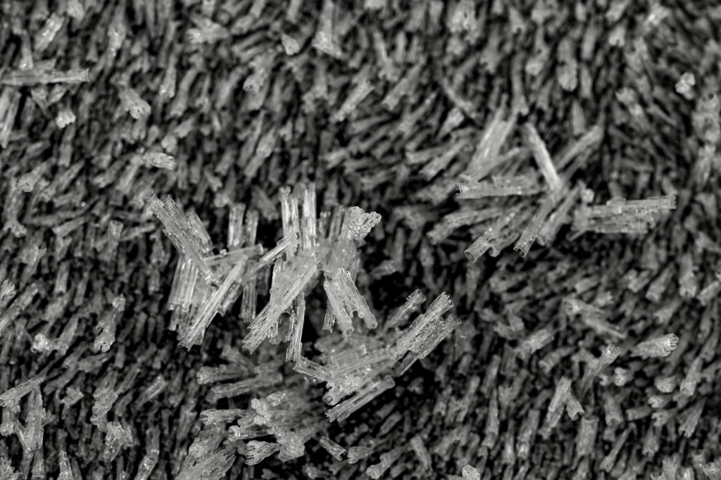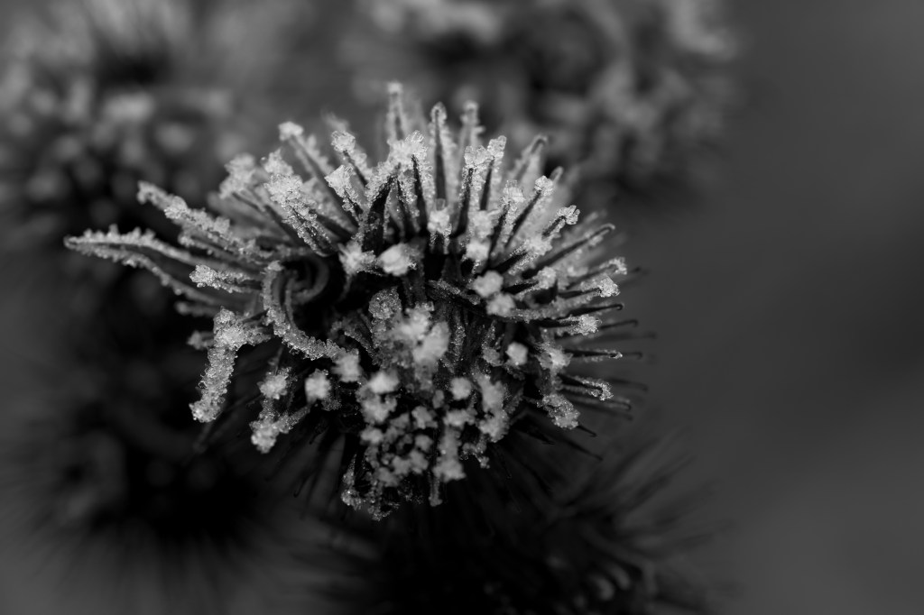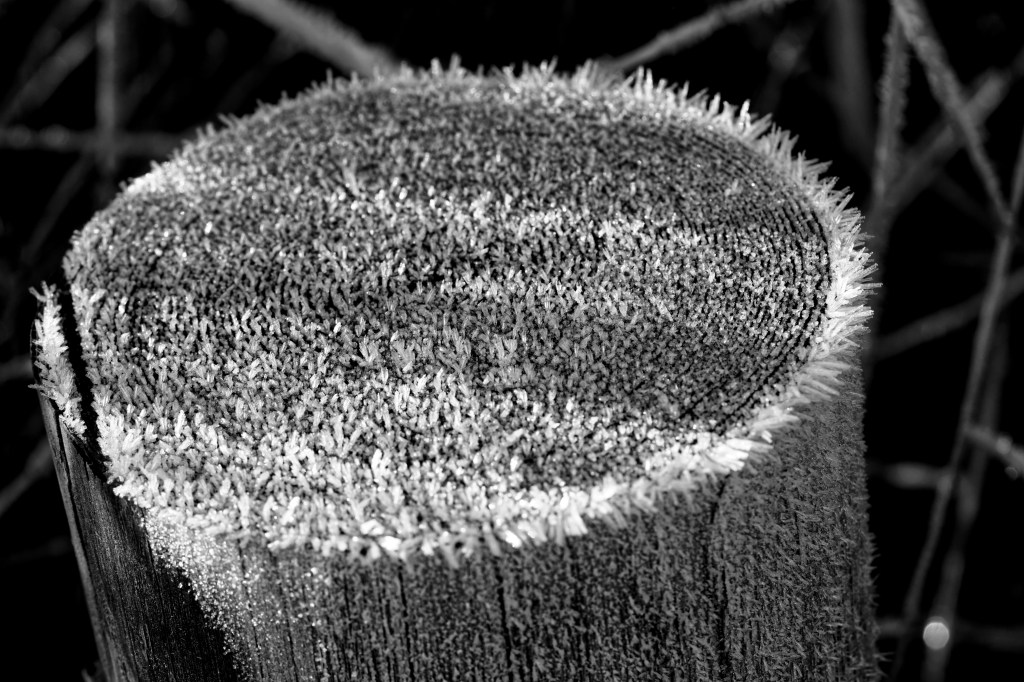 Here are some black and white images of frost and ice crystals taken on two different days last year. In November, we walked around a part of Fornebu, just outside of Oslo, and enjoyed the crystals growing on various items — and in December, I shot a bit of frosty nature around our garden. I always love when ice crystals grow on those frosty, humid mornings. It’s the “good” kind of ice.